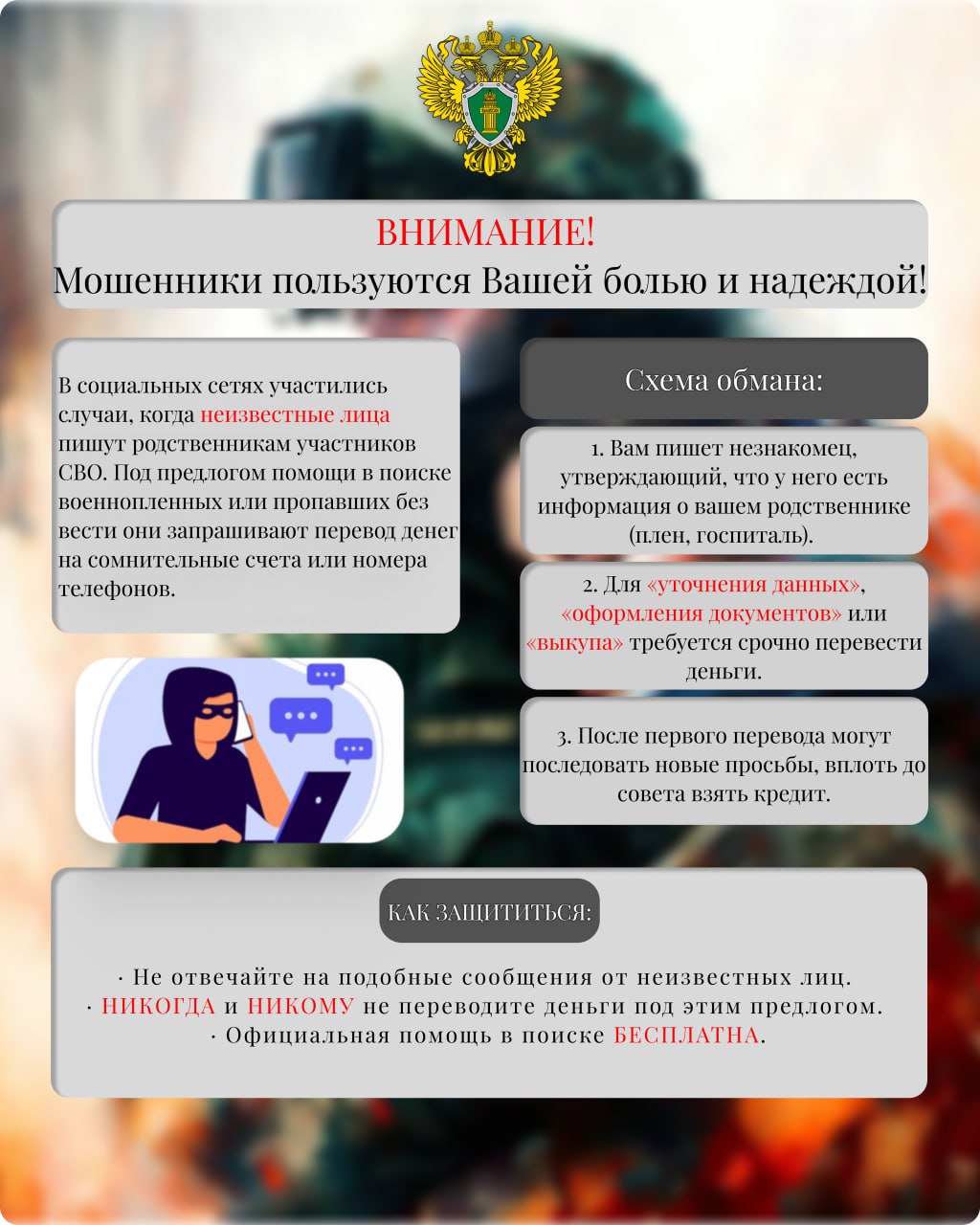 В связи с участившимися случаями мошенничества в отношении участников СВО и их семей в качестве профилактики прокуратура района просит разместить инфо